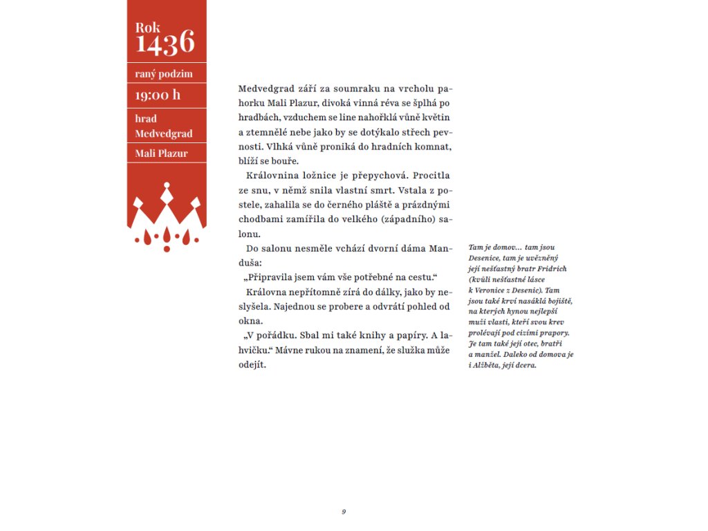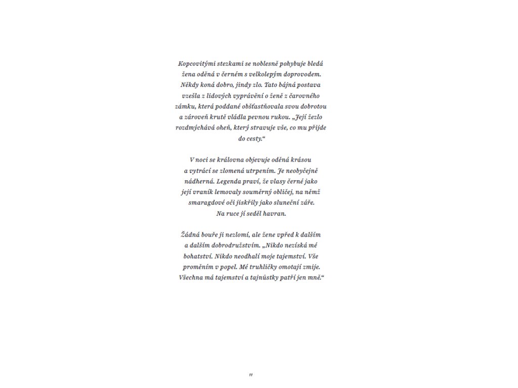 Toto je její příběh. Vyprávění o královně, která byla dobrá i zlá zároveň, vyprávění, které v sobě snoubí spletitost dávných časů, dramatické osudy panovnických a šlechtických rodů i pletichy a intriky všeho druhu.