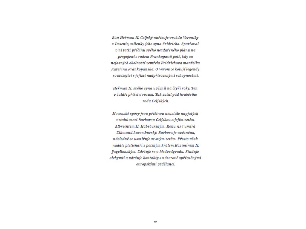 Legenda vypráví, že kdysi dávno žila jedna žena, která byla svůdně krásná, ale neměla dobré srdce. Už pouhá myšlenka na ni vzbuzovala u jejích poddaných i nepřátel strach. Její jméno se vyslovovalo šeptem a její údajné činy vyvolávaly mráz po zádech. Byla to Barbora Celjská, druhá manželka Zikmunda Lucemburského, římsko-německá císařovna a česká a uherská královna – mezi lidmi známá jako Černá královna.