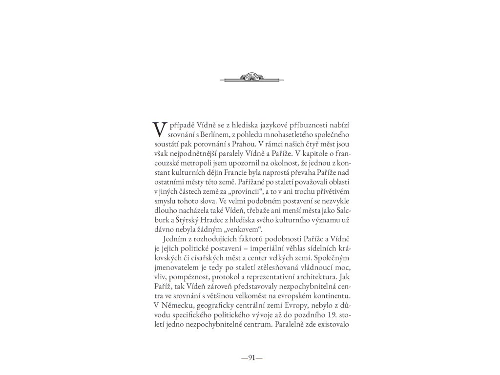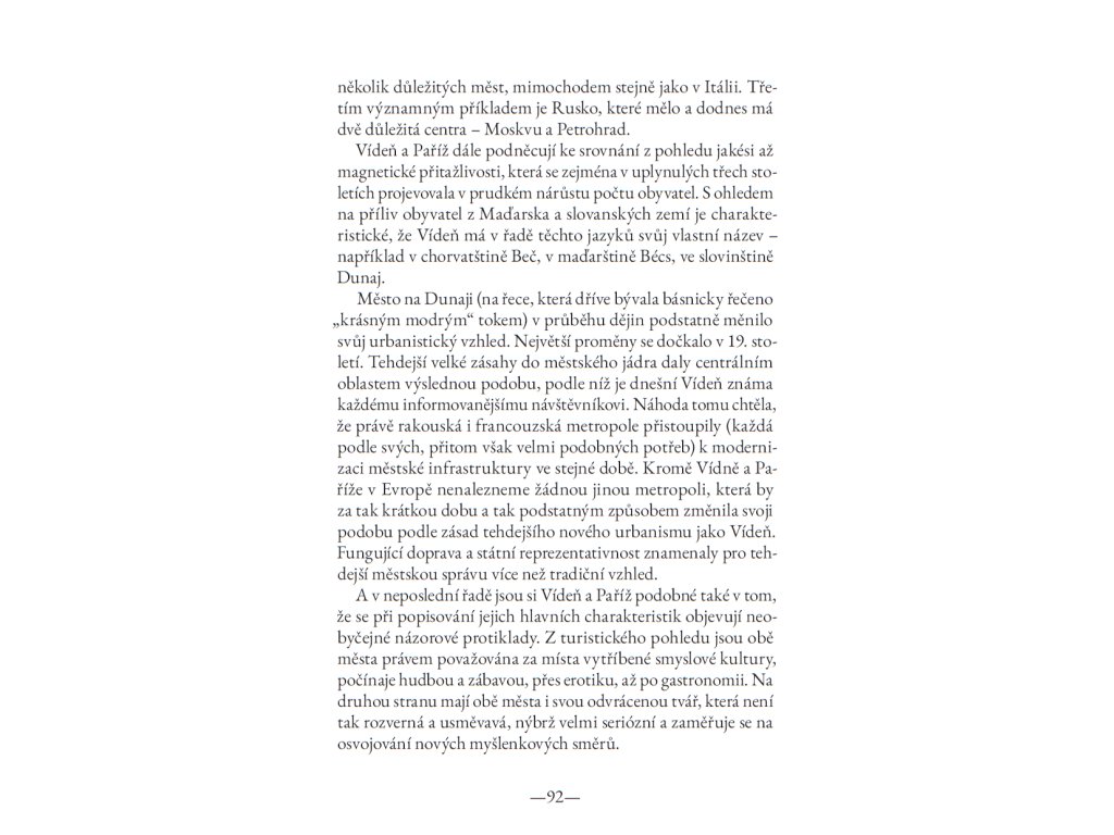 Ať už Žmegač vypráví o roli kaváren v kulturním životě Vídně, o vlivu francouzských hugenotů na berlínskou kulturu, o prostředí pařížských měšťanských salonů, o humoru v české kultuře nebo o vzájemných vlivech, podobnostech a rozdílech jednotlivých metropolí, pokaždé mistrně odkrývá pozoruhodné souvislosti i uprostřed zdánlivě zcela známých faktů.