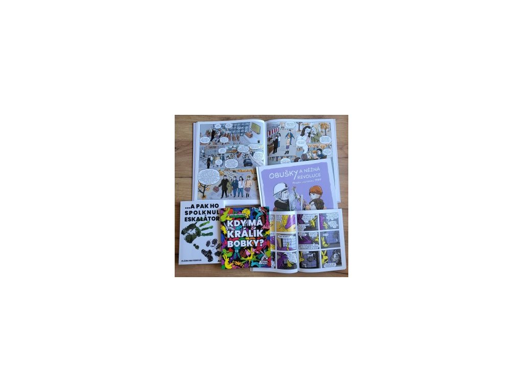 Dva komiksy a jeden příběh ve stylu žánru fantasy: OBUŠKY A NĚŽNÁ REVOLUCE, …A PAK HO SPOLKNUL ESKALÁTOR a KDY MÁ KRÁLÍK BOBKY?
