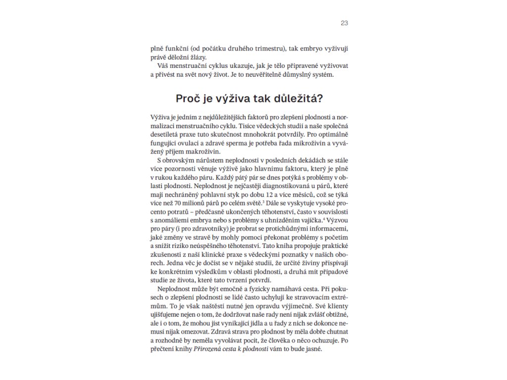 Nikoliv náhodou je tento světový bestseller mnohými odborníky nazýván „biblí plodnosti“. Přáním autorek je, aby se kniha Přirozená cesta k plodnosti stala průvodcem a spolehlivým společníkem při vykročení na cestu k vybudování vaší rodiny. Zároveň vyjadřují přesvědčení, že ve světě, kde stále více párů čelí obtížím spojeným s plodností, může právě váš přístup k výživě a k životnímu stylu sehrát naprosto zásadní roli.
