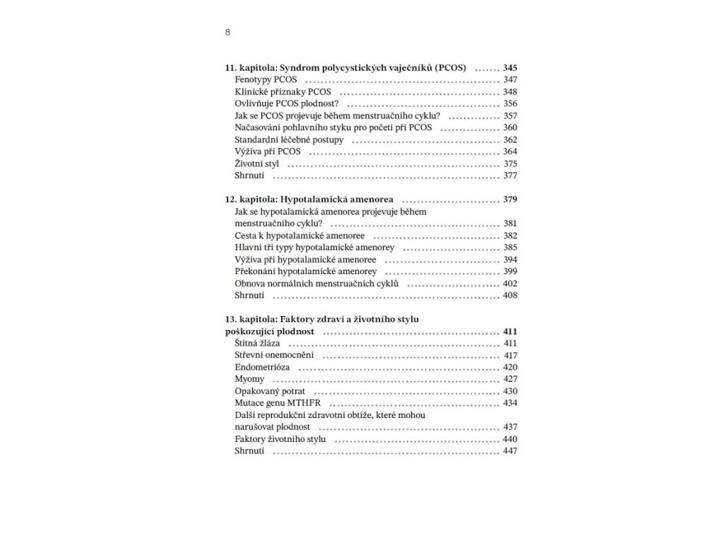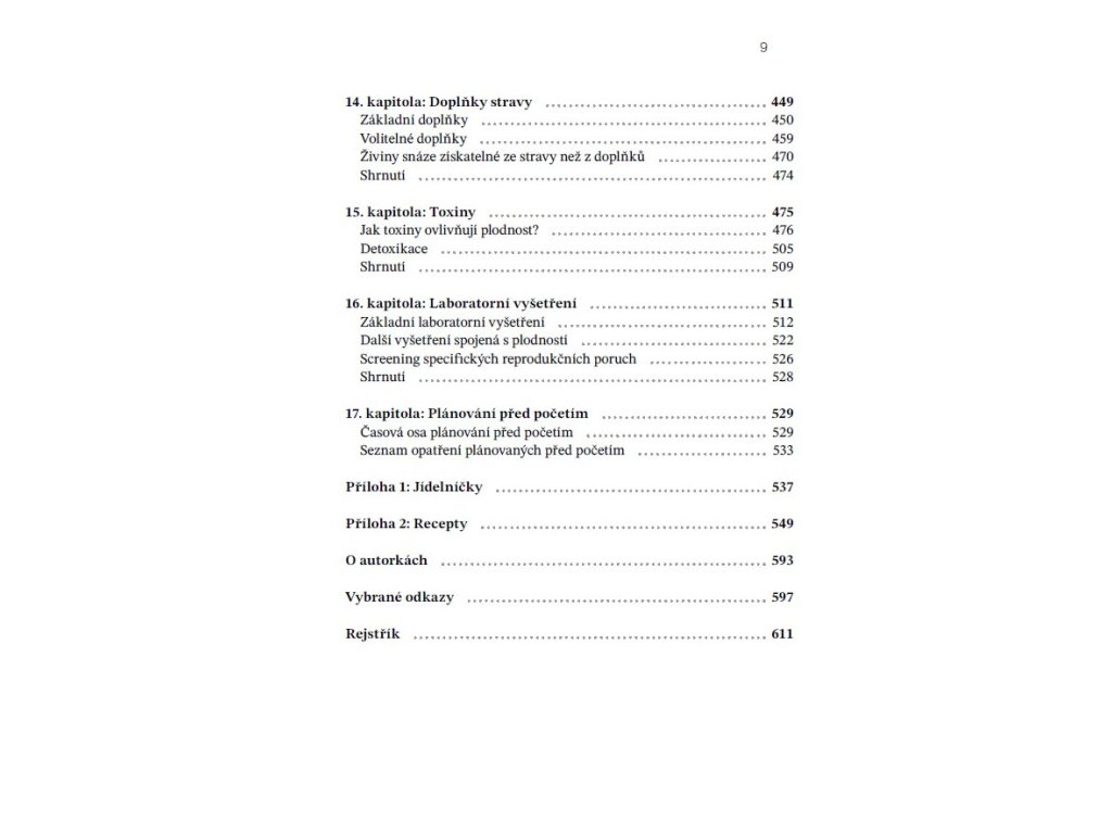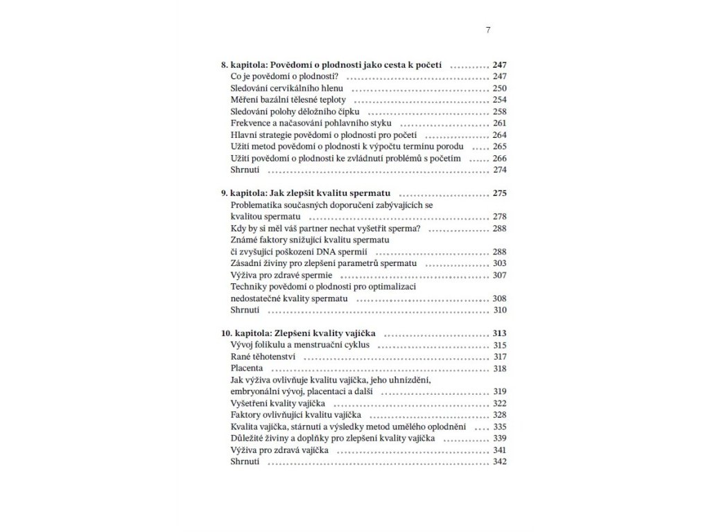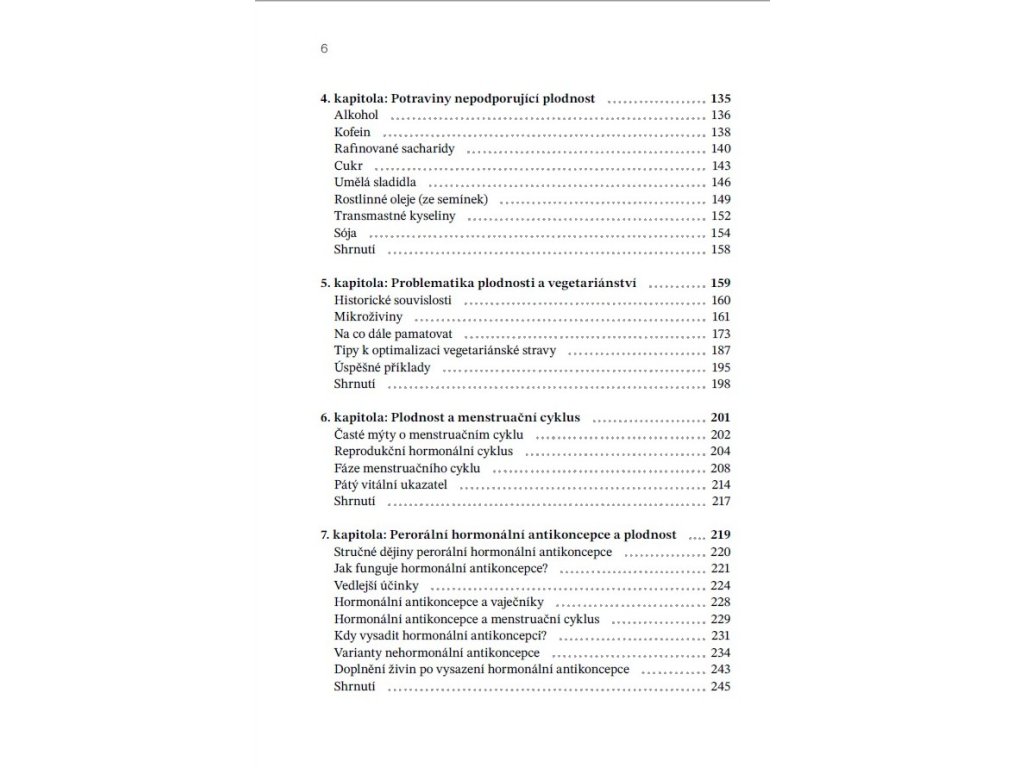 Kniha se však zdaleka netýká jen výživy. Rozebírá rovněž témata, jako jsou menstruační cyklus, povědomí o plodnosti, metody antikoncepce, zvládání stresu, problematika toxinů, metody umělého oplodnění a většinu nejčastějších zdravotních komplikací, které ovlivňují plodnost. Publikace rovněž předkládá návody na sestavení nutričně vyvážených a výživných jídelníčků včetně receptů na vhodná jídla.